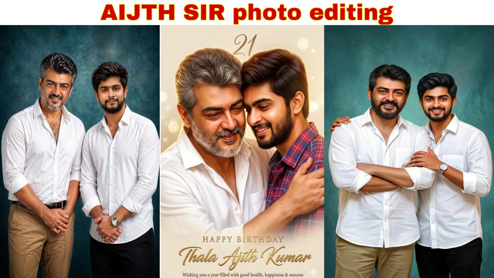 Create a highly detailed, ultra-realistic digital painting of two South Indian men sharing a warm, emotional hug.The older man resembles a charismatic actor with salt-and-pepper hair, a well-groomed beard, and a gentle, confident smile. He is wearing a simple white shirt and has a calm, affectamate expression.The younger man has a stylish haircut, trimped beard and a cheerful smile, wearing a red and blue checkered shirt. He into the hug with happiness and admirat Composition &Close-up portrait framing (chest-up) The older man’s arm wrapped around the younger man’s shoulder Both faces clearly visible, touching slightly, expressing warmth and connection Natural, affectionate body language Style & Rendering:Hyper-realistic digital painting with smooth, soft skin shading Cinematic lighting with warm golden tones Subtle highlights on hair and face for depth Clean, polished finish with pointely realism Background:Minimal soft beige/cream gradient tackground Elegant golden glow accents Add stylish calligraphy text “” in thround Typography:Add gold embossed text”HAPPY BIRTHDAY” (small elegant sen))Thala Ajith Kumar” (large, stylish cursive script in gold)” Small caption: “Wishing you a year filled with good health, happiness & success”Mood:Warm, emotional, respectful, celebratory Focus on admiration, love, and positivityQuality Tags:ultra-detailed, 4K, cinematic portrait, soft lighting, realistic skin texture, professional poster design