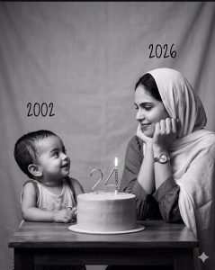 Using the images I’m going to upload to create a soft, emotional, black and white art. Let the formation be as follows: On the left: a child version of me (from a childhood photo) looking with an innocent smile to the right, with 2002 written above it.On the right: A present version of me (from a recent photo) sits with her hands under her chin and looks at the child with a calm smile, with “2026” written above her.In the middle: a table with a simple, elegant birthday cake with number 24 on top.Studio background: plain and soft (studio background)The lighting: Soft, cinematic, warm (even a black-and-white photo).Style: Professional, minimal, emotional photography, focusing on feelings and visual communication between the two versions.Make the picture look so real like a real photoshoot.Keep my original features without changing.photo size 4:5