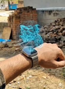 A cinematic, ultra-realistic futuristic scene featuring a sleek smartwatch on a person’s wrist in a dim, high-tech environment. The smartwatch activates and emits a vivid blue holographic interface. Concentric circular energy rings rotate smoothly around the projection, pulsing rhythmically. From the center, a detailed blue wireframe motorcycle hologram appears and begins continuous dynamic motion – rotating, tilting, and subtly shifting position in mid-air. The hologram cycles through multiple motion loops: rotating 360°, slightly expanding and contracting, and orbiting within the circular projection ring. Light particles and neon trails follow each movement, creating a layered, fluid animation.