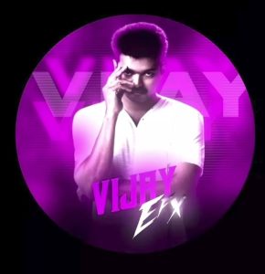 A circular profile picture 1,173 design featuring Indian young boy. He is wearing a crisp white button-down shirt and looking intensely at the camera with a serious expression, his right hand raised with fingers touching his temple. The image has a strong monochromatic purple and neon magenta aesthetic. The background features large, translucent block text reading ‘{YOUR NAME}’ and a horizontal CRT scanline texture overlay. At the bottom, there is sharp, stylized white text that reads Virat Kohli’. High contrast, digital fan art style, glowing neon lighting.