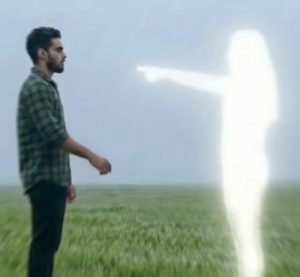 A cinematic wide shot of a young man standing in a green grassy field under a foggy, overcast sky. The man is positioned on the left side of the frame, facing right. He has short dark hair, a trimmed beard, and is wearing a dark green plaid shirt and black pants. He stands still with a serious, calm expression, looking straight ahead. In front of him, on the right side, there is a glowing white humanoid figure made entirely of bright light. The figure appears slightly feminine in shape and is semi-transparent with soft radiant edges. It is pointing directly at the man with one extended arm. The glowing figure emits a strong white aura that slightly illuminates the surrounding mist. The atmosphere is moody and surreal, with soft fog blending into the horizon. The grass is lush and slightly blurred in the foreground. The sky is gray-blue and hazy, creating a mysterious, dreamlike environment. Cinematic lighting, shallow depth of field, ultra-realistic, high detail, dramatic composition, 4K resolution